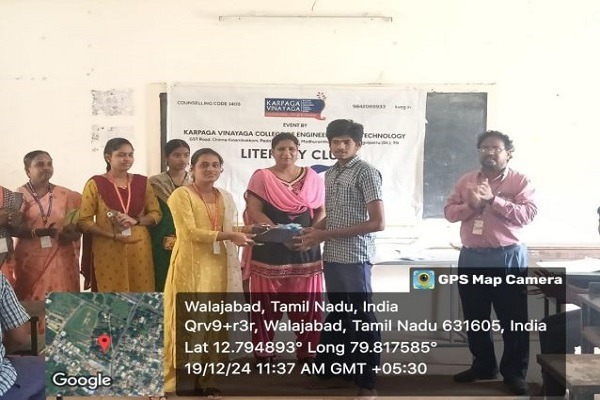 At KarpagaVinayaga College of Engineering and Technology, The core objective of a literary club is to foster a vibrant community of literature enthusiasts dedicated to exploring, discussing, and creating literary works. By encouraging a love for reading and writing, the club aims to promote diverse literary forms and enhance members' critical thinking and creative expression. Functions of the club include organizing regular book discussions, writing workshops, author readings, and collaborative projects, all of which are designed to inspire and support members in their literary pursuits. Through these activities, the club cultivates an inclusive environment where individuals can share their insights, exchange ideas, and develop their skills while deepening their appreciation for the written word. The aim of a literary club is to foster a passionate and engaged community of literature enthusiasts who come together to explore, appreciate, and create literary works. Its purpose encompasses promoting a love for reading and writing while providing a supportive environment for the exchange of ideas and perspectives. Through organized discussions, workshops, and events, the club encourages members to delve into diverse genres, enhance their critical thinking skills, and develop their creative abilities. Additionally, it seeks to nurture local talent by providing a platform for emerging writers and facilitating connections among members. Ultimately, the literary club serves to enrich its members’ understanding of literature and cultivate a deeper appreciation for the art of storytelling.